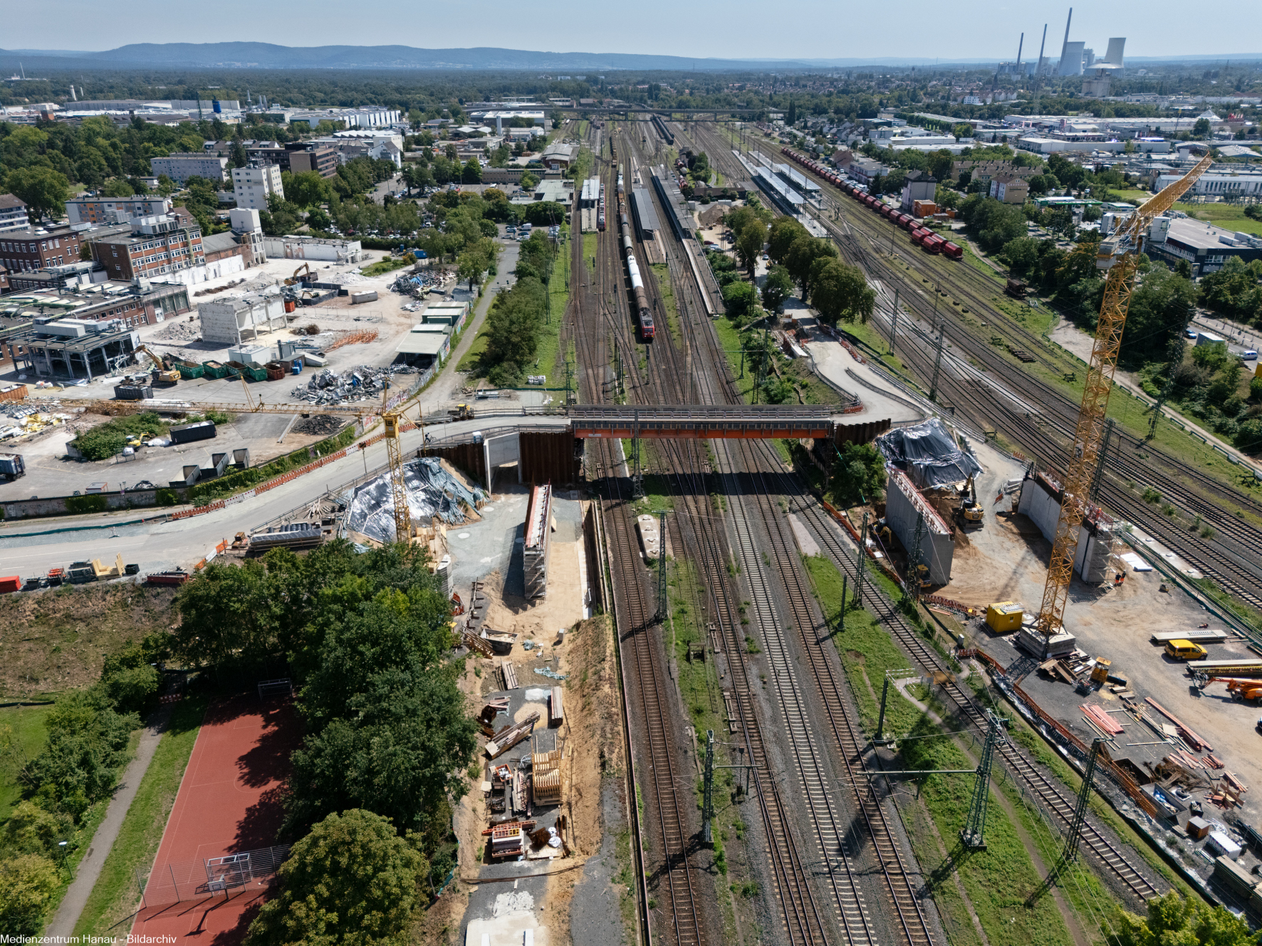 Am Wochenende vom 23. und 24. August wurden die ersten neun Verbundfertigteilträger für den Neubau der Hanauer Hauptbahnhofbrücke erfolgreich eingehoben. Die Träger bilden künftig die Grundlage für die Fahrbahn sowie die Fuß- und Radwege des nördlichen Brückenbauwerkes. Damit ist ein weiterer Meilenstein im größten Infrastrukturprojekt der Stadt seit Jahrzehnten erreicht. Die Arbeiten fanden während einer 32-stündigen Sperrpause des Bahnverkehrs statt. Sämtliche Abläufe, von der Anlieferung der rund 52 Meter langen Fertigteilträger über den anschließenden Einhub mit zwei Mobilkranen bis hin zur endgültigen Positionierung auf den neuen Widerlagerwänden, verliefen planmäßig. Auch beim Bahnverkehr gab es keine unvorhergesehenen Beeinträchtigungen; die Einschränkungen entsprachen genau den zuvor angekündigten Maßnahmen. ...