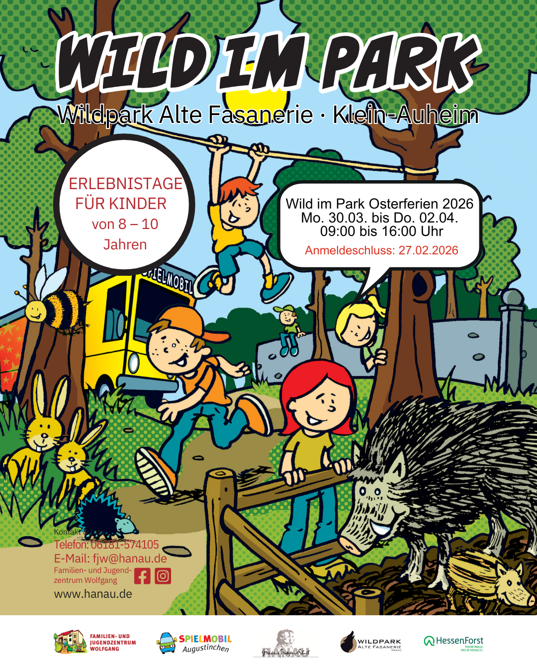 Natur, Abenteuer und jede Menge Spaß können 26 Hanauer Kinder im Alter von acht bis zehn Jahren in den Osterferien der Aktionswoche „Wild im Park“ erleben. Vom 30. März bis 02. April 2026, jeweils von 9 bis 16 Uhr, organisiert das Team des Familien- und Jugendzentrums Wolfgang mit dem Spielmobil Augustinchen ein unterhaltsames Programm und spannende Erlebnisse im Wildpark Alte Fasanerie in Klein-Auheim.