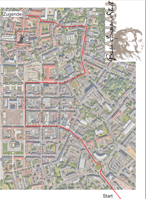 Sandgasse - Rochusplatz - Hauptstraße - Brückenstraße - Irminratstraße - Paul-Gerhardt-Straße - Hauptstraße - Rochusplatz - Rochusstraße - Überquerung Bahngleise - Zugauflösung Waldstraße Ecke Spitzenweg.