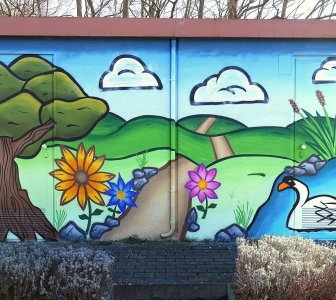 "Im Stadtteil Lamboy/Tümpelgarten haben wir viele verschiedene Kunstwerke. Etwa das Pumpstations-Häuschen am Kinzigdamm in Höhe der Sandelmühle, initiiert und bezuschusst von unserem Ortbeirat und ausgeführt von Rautie, die Lamboy-Brücke an der Kinzig, gestaltet vom Lamboy-Park, und die Nordbahnhof-Unterführung, initiiert von ‚Freunde und Förderer Lamboy-Tümpelgarten‘, gestaltet von ‚Hanau Radau‘", berichtet Ortsvorsteherin Rosemarie Thiel. Das neuste vom Ortsbeirat Lamboy/Tümpelgarten angestoßene Projekt wurde dieser Tage von fünf Mitgliedern der Senioren-Graffiti-Gruppe "Sprayground Old Robinson" mit Unterstützung von Künstlern des "Spray Café" in der Otto-Wels-Straße fertiggestellt. Das jüngste Hanau ART-Wandbild an einem Trafohäuschen der Stadtwerke heißt "Flora und Fauna" und bildet das Leben am Fluss ab: Eine Forelle fängt eine Fliege, während ein Eisvogel vorüber fliegt. Am Ufer nagt eine Nutria zwischen Scharfgarbe, Nelke und Hahnenfuß. Ein Frosch sitzt auf einer Seerose und eine Maus fährt in einem Kanu vorüber. Ein Igel wird von einer Eule beobachtet, während Pferd und Kuh in den Auen grasen. "Während der Arbeiten kamen wir mit Bewohnerinnen und Bewohnern sowie Passanten bei Kaffee und Kuchen ins Gespräch", berichtet Martin Hübscher, Graffiti-Künstler und Mitarbeiter im Familien- und Jugendzentrum Wolfgang, der diese und viele weitere Aktionen organisiert. Am gestrigen Donnerstagabend hatte der Ortsbeirat Lamboy/Tümpelgarten die Unterstützung des Projektes mit 1518,93 Euro beschlossen.
