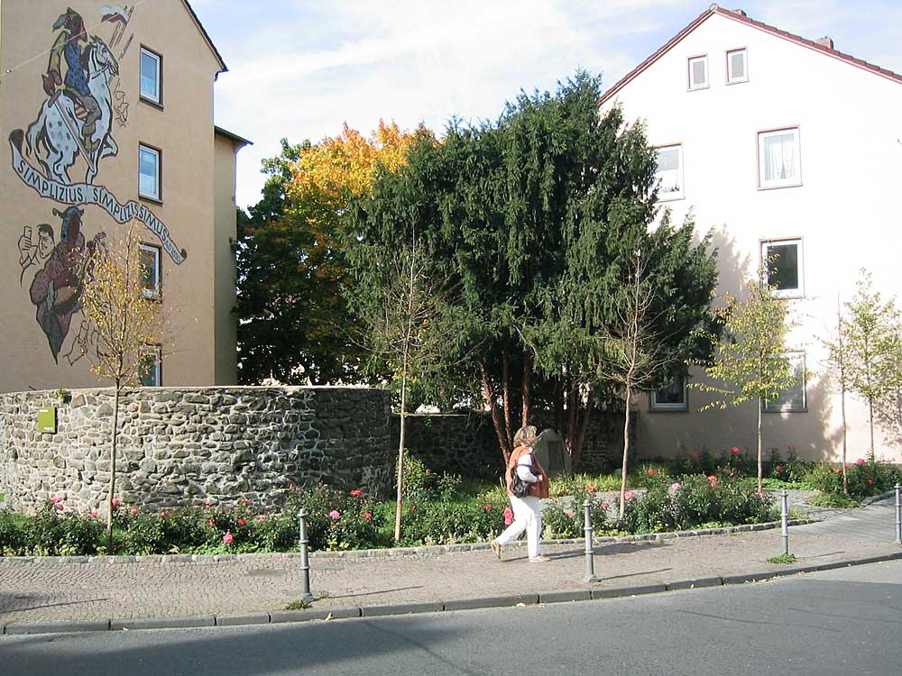 Die Grünanlage liegt direkt vor den Resten der alten Stadtbefestigung Hanaus. Auf der anderen Straßenseite stand die in der Pogromnacht im November 1938 verbrannte Synagoge.