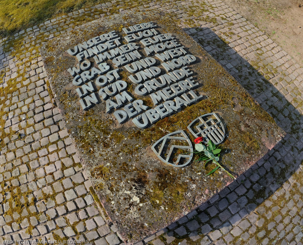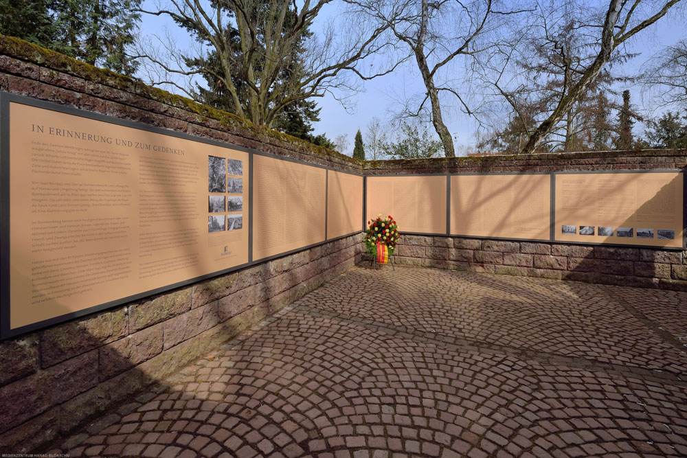 Auf den Gedenktafeln sind die Namen der Getöteten der Luftangriffe festgehalten, an denen Hanau in Schutt und Asche sank.