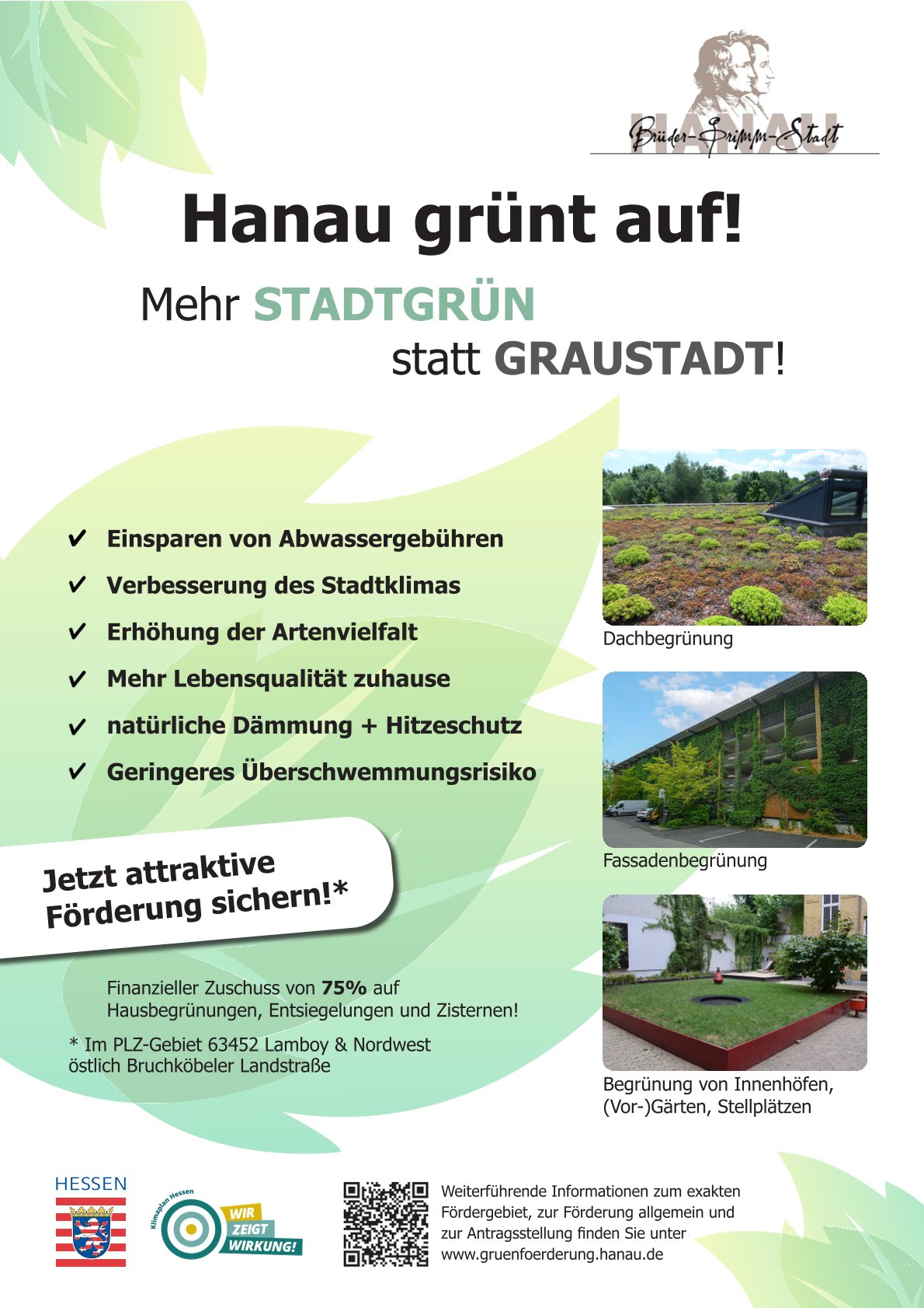 Die Stadt Hanau unterstützt Sie mit Fördermitteln des Landes Hessen im Rahmen des Klimaplan Hessen dabei, Ihren Beitrag zu einem grüneren und gesünderen Wohnumfeld sowie einer lebenswerteren Stadt zu leisten! Sie wohnen im Fördergebiet, welches sich über das Lamboy sowie dem östlichen Teil von Hanau Nordwest erstreckt, und möchten Ihr Haus und/oder Grundstück grüner gestalten? Dann nehmen Sie unseren Grün-Zuschuss in Höhe von 75 Prozent der zuwendungsfähigen Ausgaben bei einer maximalen Zuwendungssumme von 20.000 Euro in Anspruch!